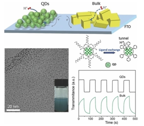 The zero-dimensional (0D) material refers to materials with three dimensions in the nanoscale range (0–100 nm), or consisting of them as the basic unit. Due to the significant proportion of surface atoms, their surface density of states is greatly increased at the same time; for such small particles, certain quantum effects (e.g., quantum size effect, quantum limitation effect, quantum tunneling effect, quantum interference effect, etc.) are notable. The small size of 0D materials in the electrochromic device significantly shortens the diffusion path of the intercalated ions in the solid phase, (1)which helps to achieve fast charge/mass transfer; (2) the large surface-to-volume ratio of the quantum dots facilitates close contact between the electrode material and the electrolyte/collector, thus providing fast charge-transfer and electron-transfer kinetics; and (3) the significantly higher ratio of surface atoms makes the quantum dot electrodes more active in electrochemical reactions. Zhao [69] reported tungsten oxide quantum dot electrochromic supercapacitors, where tungsten oxide quantum dots of 3 nm in size were synthesized by a hydrothermal method, as shown in Figure 4. Compared to bulk tungsten oxide, the quantum dot tungsten oxide has a wider forbidden band, and the Faraday electrochemical process is accelerated, showing excellent electrochemical and electrochromic behavior. Another major task of the paper was to maintain the dispersion stability of the quantum dots, which were wrapped in an octane diamine ligand and modified with a conductive pyridine ligand on the surface. The final device had a fading time of 1 s and a coloring efficiency of 154 cm2/C. The synthesis of tungsten oxide quantum dots by hydrothermal methods is difficult, mainly because the material tends to agglomerate into clusters or lumps during the synthesis process. However, in the synthesis of other dimensional materials, low concentrations of tungsten oxide quantum dot byproducts can be obtained, which can be purified to obtain a high-concentration solution [70].