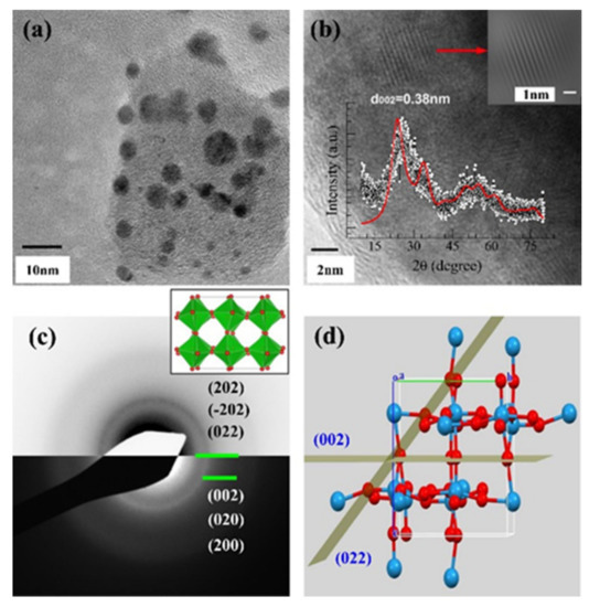 (a) TEM and (b) HR-TEM images with 10 and 2 nm scale bars, respectively. The inset shows the X-ray nature of the synthesized film. The SAED pattern of the corresponding film is shown in (c), and the inset shows that the monoclinic WO3 phase is mostly composed of corner-linked octahedra of 4-membered channels along all crystallographic directions. The 002 and 022 crystallographic planes obtained from the SAED patterns are projected in (d). All crystallographic projections were made with the VESTA structure drawing software [71].