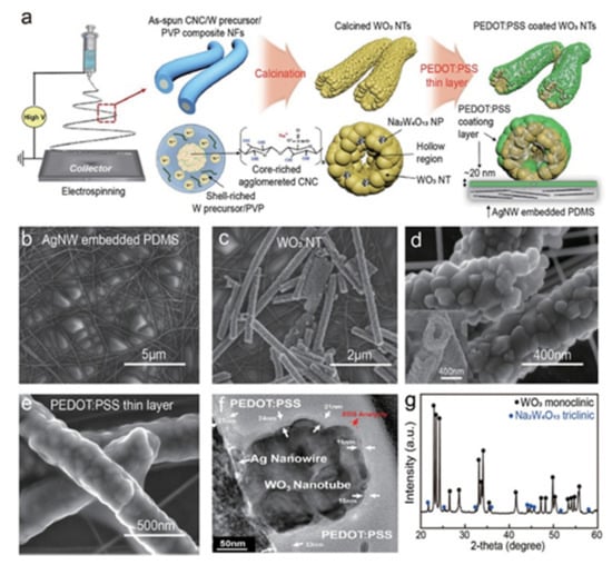 (a) Schematic illustration of the fabrication process of WO3 nanotubes and PEDOT:PSS layer. Characterization of Ag-nanowire-embedded PDMS substrate and WO3 nanotube–PEDOT:PSS thin layer. Scanning electron microscope images of (b) Ag-nanowire-embedded PDMS, (c) WO3 nanotube coated on Ag-nanowire-embedded PDMS, (d) cross-section image of a WO3 nanotube, and (e) PEDOT:PSS thin layer coated on a WO3 nanotube. (f) Transmission electron microscope cross-section image of a PEDOT:PSS thin layer coated on a WO3 nanotube. (g) X-ray diffraction results of the WO3 nanotube [85].