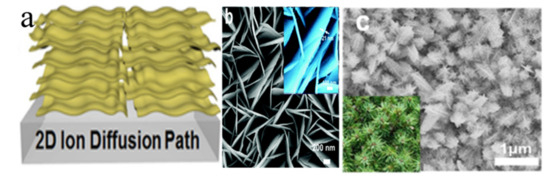 In addition to the low-dimensional tungsten oxide structures, the tungsten oxide nanostructures of two-dimensional tungsten oxide nanosheets and three-dimensional tungsten oxide have also been reported, as shown in Figure 8, but the porosity and lifetime of the electrodes composed of both do not reach the low-dimensional level; therefore, the device efficiency and lifetime are low. However, there are some reports in the field of sensors and batteries with low life requirements.