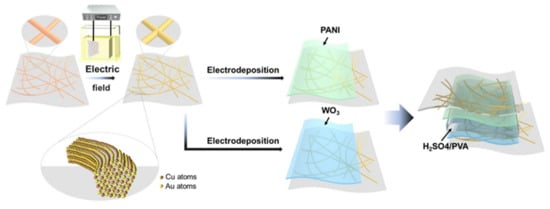 - Zhang, H.; Tian, Y.; Wang, S.; Huang, Y.; Wen, J.; Hang, C.; Zheng, Z.; Wang, C. Highly stable flexible transparent electrode via rapid electrodeposition coating of Ag-Au alloy on copper nanowires for bifunctional electrochromic and supercapacitor device. Chem. Eng. J. 2020, 399, 125075. [Google Scholar] [CrossRef]