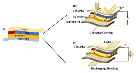 - Zhang, J.; Yang, J.; Leftheriotis, G.; Huang, H.; Xia, Y.; Liang, C.; Gan, Y.; Zhang, W. Integrated photo-chargeable electrochromic energy-storage devices. Electrochim. Acta 2020, 345, 136235. [Google Scholar] [CrossRef]