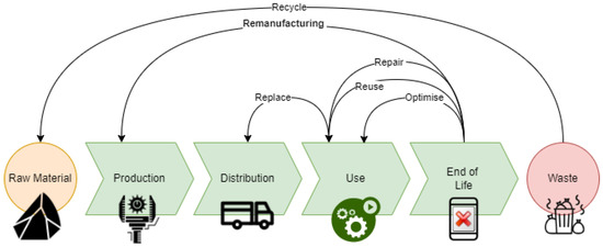 Unsustainable consumption and production contribute to the exhaustion of natural resources and the escalation of adverse ecological consequences, posing worldwide challenges for sustainable development. As economic activity has improved significantly throughout the world, the per capita consumption of goods and services has also increased [1,2]. As a result, greater demand for products and services puts pressure on resources and the environment [3]. To fulfill the current demand, contemporary linear production models based on “Take-Make-Use-Dispose” are utilized [4]. In the model, natural resources are extracted, transformed into goods, and disposed of at the end of their useful lives.