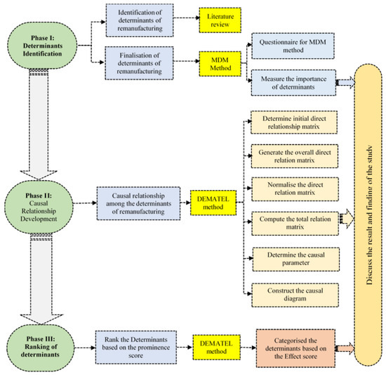 For this study, we used a three-phase methodology. Phase I focuses on identifying and finalizing determinants of remanufacturing adoption, while Phase II focuses on developing causal relationships between the determinants. Phase III ranks the determinants based on the prominence score. The first phase is to identify the determinants for remanufacturing adoption by reviewing the literature on CE, sustainable supply chain, and remanufacturing. The identified determinants are finalized by the Modified Delphi Method (MDM). The second phase identifies the relationships between the finalized determinants. Numerous methods for developing the causal relationship are available in the literature, including Interpretative Structural Modelling (ISM), Total Interpretative Structural Modelling (TISM), WING, and DEMATEL [41,42,43,44]. These approaches have some drawbacks—for example, ISM and TISM only provide qualitative assessment; quantitative components are absent from these methods [45]. Additionally, Gupta et al. [30] claim that DEMATEL has the ability to assess the degree of interaction between the barriers. As a result, it is preferable to employ DEMATEL to investigate the causal relationships between the finalized determinants. Figure 2 include the research framework of the proposed work.