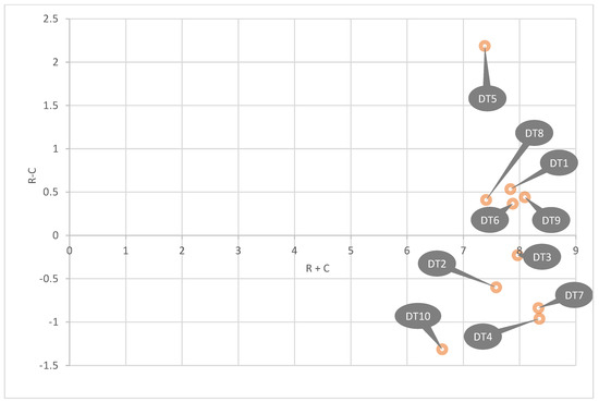 As per the value of (), the determinants are divided into an influential and influenced group. The prominence vector () is plotted on the horizontal axis, and the net effect vector () is plotted on the vertical axis. In this manner, the causal relationship map is established and shown in Figure 3.