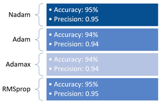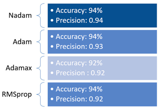 Binary_crossentropy was the loss function used because Teja, Sasank and Reddy [33] state that it works best for binary classification problems such as phishing detection. Figure 4 outlines various optimizers which produced accuracies higher than 90%. It was expected that the nadam optimizer would be used as Pavan Kumar, Jaya and Rajendran [34] achieve a high accuracy with this optimizer; however, during the Keras experiment, the nadam optimizer achieved the highest accuracy. Kewei et al. [35] in their research into fraud detection (a binary classification problem) used the nadam optimizer.