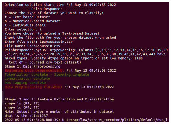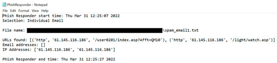 Alongside accuracy and precision, Phish Responder can identify phishing and spam emails in a timely manner as it can be used via the command prompt. This provides users with a quick identification of phishing and spam emails within a dataset and a quick extraction of features from an individual email. It is not known whether the existing research, presented in Table 8, has developed its techniques for the command prompt; however, Junnarkar et al. [5] provide a distinguishable feature which is real-time classification of emails—a feature neither included in Phish Responder nor Bountakas, Koutroumpouchos and Xenakis [6].