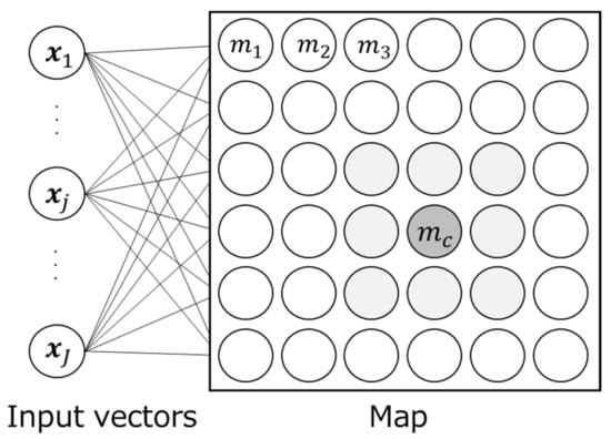 where is a neighborhood function determined by the positions of winner node and node , is the distance between the nodes and on the map, is the learning rate, and is a function that determines the size of the update area; and are set to decrease as the number of updates increases. By repeatedly determining the winner node and updating the reference vectors, the SOM is trained. The algorithm described above is a common technique called online learning. By contrast, batch learning that does not depend on the order of input has also been proposed []. In batch learning, after the winner node of all inputs is determined, the map is updated using the following formula: