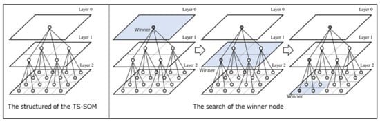 As mentioned in the Introduction, if the number of nodes in a SOM increases, the number of search nodes needed to determine the winner nodes increase, and the calculation time increases. Therefore, a tree-structured SOM (TS-SOM), which uses the tree search method in the SOM, was proposed []. The structure of a TS-SOM is shown on the left-hand side of Figure 2. A TS-SOM is a SOM composed of multiple layers and has a structure in which the number of nodes increases from the upper layers to the lower layers. The nodes of the upper layer have links to the nodes of lower layer, and the winner nodes determined in the upper layer assist the search for the lower layer’s winner nodes to speed up the search for the winner nodes. The right-hand side of Figure 2 shows how to determine the winner node in a TS-SOM. The lower winner node is determined from the child node group that has a link from the winner node determined in the upper layer. As in a SOM, the nodes of each layer in a TS-SOM are arranged in a two-dimensional grid pattern. Therefore, a TS-SOM also has map edges.