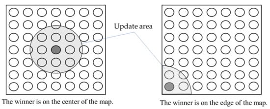 Next, we describe the shape of the SOM. Normally, the SOM arranges nodes on a two-dimensional grid pattern for learning. Therefore, a SOM is a map with edges. The presence of the edges of the map causes a difference in the size of the update area of a winner node at the center of the map and a winner node at the edge of the map. Figure 3 shows the update area according to the position of the winner node. In addition, because of the characteristics of the SOM, if the map has an edge, the SOM tends to collect data at the edges of the map. Therefore, to eliminate differences in the size of the update area, the torus SOM, which has a map without edges, and the spherical SOM (S-SOM), which arranges nodes on a spherical surface, were proposed [,]. Figure 4 shows the map shapes of the torus SOM and the S-SOM. In the torus SOM, by connecting the edges of the map as shown in the Figure 4, the edges of the map are eliminated. The torus SOM can learn uniformly regardless of the position of the winner nodes. However, when the map is visualized, it is necessary to consider the connections between the edges of the map, which make it difficult for humans to intuitively understand the result. In this study, we chose to arrange nodes on a sphere for intuitive visibility. Intuitive visibility is achieved by drawing the spherical map in three dimensions and rotating the spherical map for viewing.