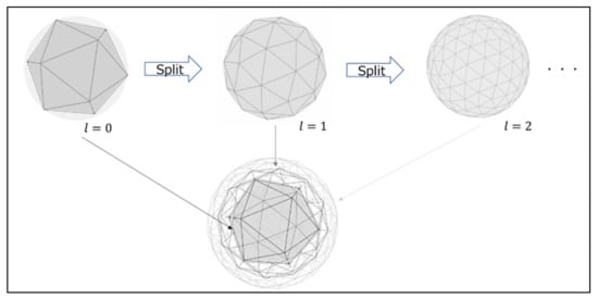 An S-TS-SOM has multiple layers, each layer has a node , and node has a reference vector . Here, indicates the level of the layer, and in order from the inner layer to the outer layer. In addition, indicates the node number of the th layer. We used an icosahedron for the innermost polyhedron, and because we divide the icosahedron to increase the number of layers, the number of nodes in each layer is expressed by the following formula.
