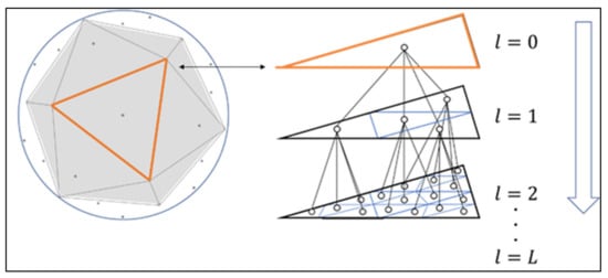 In this section, we describe the S-TS-SOM. The basic structure is the same as that of a TS-SOM. However, in an S-TS-SOM, nodes are evenly arranged on a spherical surface to eliminate the edges of the map. In this paper, we use polyhedrons inscribed in a sphere to arrange the nodes on the spherical surface. The nodes are arranged as follows. First, we divide the icosahedron and stack it, as shown in Figure 5. Next, nodes are placed on each surface of the polyhedrons, and links are added from the nodes of the inner layer to the nodes of the outer layer. Using this process, the tree structure is constructed for each face of the polyhedron, as shown in Figure 6. In the method proposed in this paper, except for the outermost layer’s nodes, the tree structure is created such that each node has four links to the outer layer’s nodes. The direction of layering is not important because it does not change the underlying concept. However, for the sake of explanation, we create the structure such that the outer layer has more nodes.