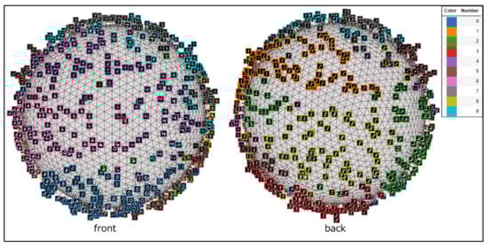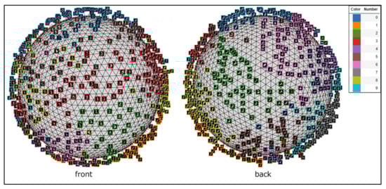 For reasons of visualization, we used a total of 1000 images (100 extracted from each category) as the training data. We set the number of layers of the S-TS-SOM to . Parameter was set to decrease as the inner layers become outer layers. (). In addition, the of each layer was set to decay linearly with the number of updates, with as the initial value. The of the 0th layer was set with 180° as the initial value. We set the number of updates for each layer to 100. Figure 7 shows the result. For comparison, we show the result of the S-SOM in Figure 8. We placed the nodes of the S-SOM on the faces of the polyhedron, set the number of the S-SOM updates to 100, and updated the map by batch learning. The of the S-SOM was set with 180° as the initial value. For the sake of clarity, we added colors to the MNIST images according to each category. The results show that similar images are gathered close to each other on the maps generated by both the S-TS-SOM and S-SOM. These results indicate that the S-TS-SOM is working properly as a visualization tool.