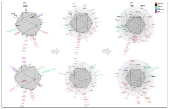 We used the Zoo dataset of UCI as the experimental data []. The Zoo dataset is composed of 101 species of animals, where each animal has 17 attributes. We used 16 attributes as the input and excluded the “type” attribute. Therefore, each animal was treated as a vector with 16 elements. Because the “legs” attribute is not a Boolean value, we used the value divided by the maximum value in the “legs” attribute as the input. The “type” attribute classifies each animal into an animal type using a number from one to seven. We set the number of layers of the S-TS-SOM to L = 2 and the number of updates for each layer to 100. Figure 9 shows the results. In Section 3.1, we presented only the outermost layer of the S-TS-SOM. However, the other layers are also shown in Figure 9, and the labels are color-coded according to the “type” attribute. In Figure 9, the top row shows the front of the map, and the bottom row shows the back of the map. We plotted the data placed on the same winner node in the same direction as seen from the center of the sphere. If only one data point was placed at a node in a layer other than the outermost layer, the branch growth was stopped for the sake of visibility.