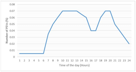 It is considered that the drivers that charge their PEV at OAKA are the drivers that work and exercise in the sport center, the drivers living in the nearby area as well as the drivers who charge their PEV at OAKA as a stopover before their destination. Most people go to work between 7:00 to 9:00. Furthermore, the majority of sport activities are between 9:00 to 13:00 and 17:00 to 20:00. Hence, most of the arrivals are estimated to take place in these hours as the majority of the PEV drivers who parked at the sport center are those who are training there. Moreover, most people return from their morning work between 15:00 to 17:00. Taking the above into consideration, the arrival profile of PEV is presented in Figure 1. Number of PEVs represent the number of PEV that charge at the sport center every day. Five different scenarios are considered as explained in Section 4.