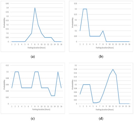 The duration of sport activities is usually between 1 to 4 h. In addition, most people work about 8 to 9 h. Hence, the parking duration probability depending on the arriving time is presented in Figure 2.