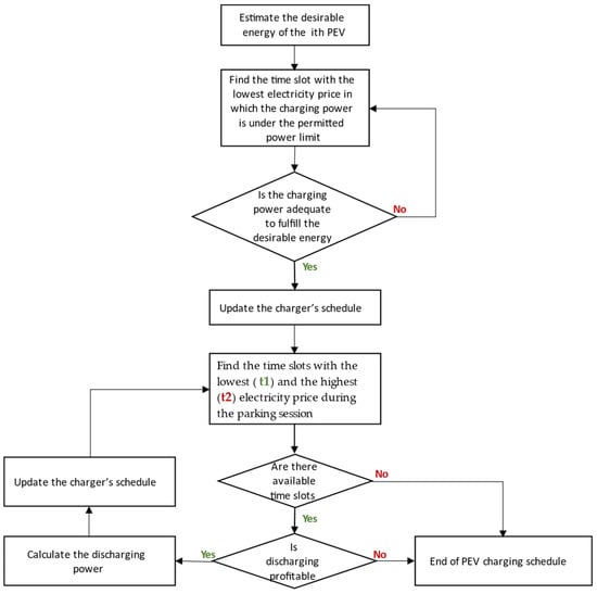 where nch and ndis are the charging and discharging efficiencies. In this study they are considered equal, and both are being represented by the n parameter. This coefficient is considered to be equal to 0.93 and it represents the energy losses during the charging and discharging process. The tB and tS are the time slots that the energy will be bought from and sold to the grid, respectively. C is the electricity price. The flowchart of the proposed charging strategy is illustrated in Figure 4.