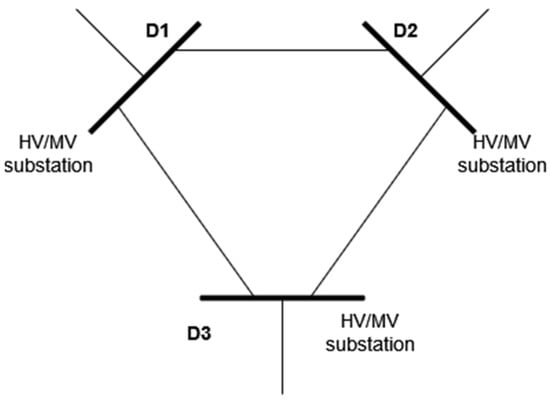 OAKA is supplied by three (3) high/medium voltage (HV/MV) substations (D1, D2 and D3) and there are twenty-two (22) medium/low voltage MV/LV substations. The power limits of the HV/MV substations are = 6 MVA, = 8 MVA and = 6 MVA. The simplified sketch of the considered microgrid is depicted in Figure 5.