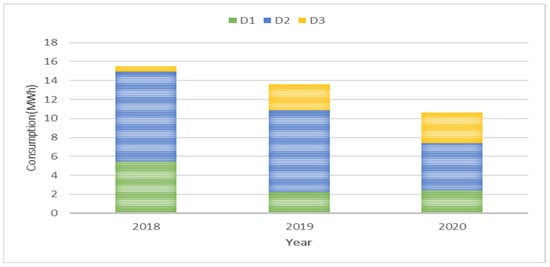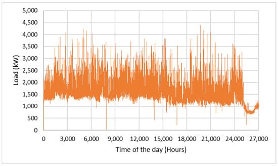 To select the appropriate data for the calculations of the next section, the sport center’s load for the years 2018–2020, is analyzed. Even though the load of the year 2020 was significantly low because of the regulations that were taken during COVID-19 pandemic, the demand peak was higher than the other two years. The total load, the average seasonal load and the load time series of OAKA for the years 2018–2020 are depicted in Figure 6, Figure 7 and Figure 8. Year 2020 was not considered in the calculations because of its extended deviations due to the pandemic. Hence, the load of the OAKA microgrid in the first year of the investment period was estimated as the average demand of the year 2018 and 2019. To incorporate the stochastic behaviour of the consumption of the microgrid, a raise of 1% of the consumption of the initial year for every next year is added, and a random value between −20 and 20 kW is added, too.