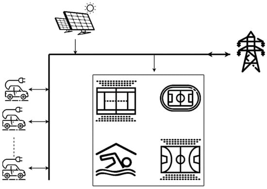 Finally, for simplification purposes the sport center is considered as one unit as illustrated in Figure 9. The arrows show the energy flow direction. The optimal PV and PEV charger distribution among the H/V substations is not considered in this study.