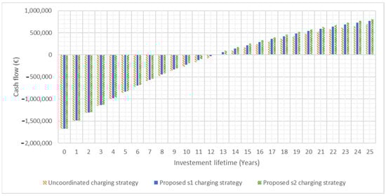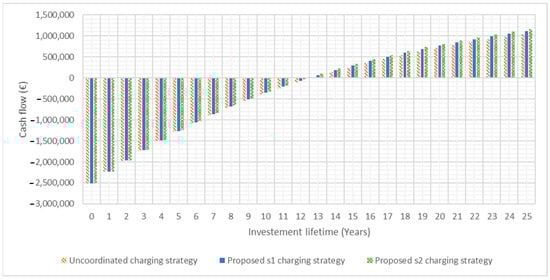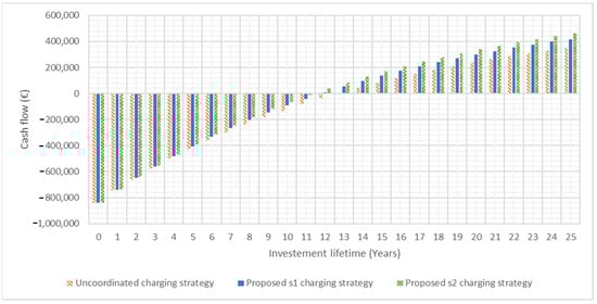 In the case study, primarily, the NPV is calculated for the uncoordinated charging strategy. Then, a comparison between the cash flow of uncoordinated and proposed charging strategy is done considering PV generation and the investment period, and it is discounted to the present. This process estimates the contribution of the proposed charging strategy (s1 and s2) versus the uncoordinated strategy expressed in monetary value.