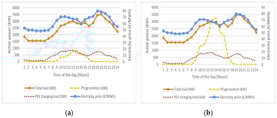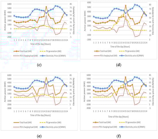 Figure 16 shows the daily electricity price, PV generation, PEV charging load and total load of the OAKA microgrid when the PEV number is 500 and for different PV generation and charging strategies. The number of PEVs that is selected to be demonstrated in Figure 16 is 500 because their charging load is the highest and it can be observed better the influence of the PEV charging load on the microgrid total load curve. It can be observed that when the uncoordinated charging strategy is applied, the electricity price and the PV generation do not affect the total load of the microgrid as the PEV charges after they plug-in without taking into consideration any other factors (Figure 16a,b). On the other hand, when s1 is applied, the PEV charging load influences the total demand of the microgrid significantly, as is shown in Figure 16c,e. The peak demand of the microgrid is shifted during the time slots where the electricity price is low and new peak demand is created during the time slots where the electricity price is high. In addition, when the PV generation is introduced, s2, to the proposed charging strategy (Figure 16d,f), a part of the charging load is shifted to the time slot where the PV generation is high, and the electricity price is low.