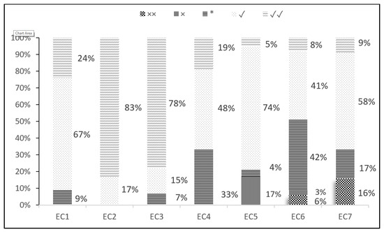 Excellency scores as a percent of articles that meet each of them (academic literature: EC1 through EC3; grey literature: EC4 through EC7).