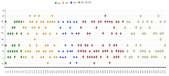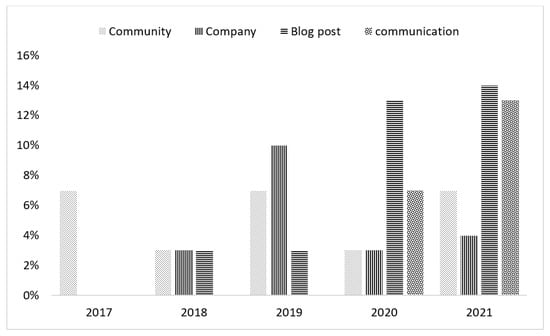 The definitive collection of publications contains 73 ALR articles, numbered from A1 to A73, and 30 GLR articles, numbered from G1 to G30 (see Table 4 and Table 5). In Figure 3, a straightforward upswing growth can be observed in the number of publications from both types of content. The rise in involvement and competence in the issue can be related to the interests and mastery of both communities. Each year in the survey, journal writings and conference papers are statistically tied to scholarly papers (see Figure 4). The number of articles presented at conferences has increased steadily; however, the amount of literature published in journals has grown considerably more rapidly. In the timespan investigated, there were 73% journal articles and 22% conference presentations. Each year, articles on professional communities have ranked first in the GLR dataset (see Figure 5), with a blog post in second place. G1 and G2 are the first community articles on protected BSN (2017). The number of articles published in professional communities reached its peak in 2019 and fell in 2020, but the slack was most rewarded by the articles published in companies’ blogs.