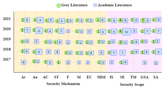 The targets and issues of each paper were accumulated and then categorized in the above list of categories. Figure 6 depicts the distribution of academic and grey studies from 2017 to 2021 by categorization. Additionally, over two-thirds (66%) of academia address BSN security issues (see Figure 7). Thirty-three percent of academic research focused on security features that have yet to be applied (see Figure 7). The goal of this research team is to generate new ideas for BSN security measures. Security mechanisms that have been incorporated are evaluated in primary analyses of academic papers (38%) by the third team. These primary studies used empirical research to better understand the benefits and drawbacks of various BSN security measures.