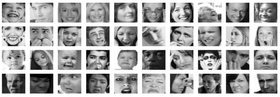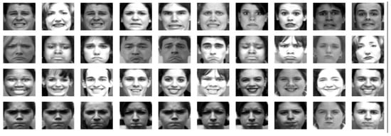 - CK+48: CK+48 is a small dataset composed of 981 images in seven classes (fear, disgust, sad, happy, neutral, surprise, angry). Images are 48 × 48 in size with a grey-scaled color palette as shown in Figure 3. The classes’ variations and feature distributions are helpful in the merging phase for other classes to obtain a good distribution and normalize the amount of data variation. Generally, images taken from video frames did not have much variation, and the total number of elements is negligible compared to other datasets. Compared with the FER-2013, images are in frontal view with a clean pattern for facial expression.