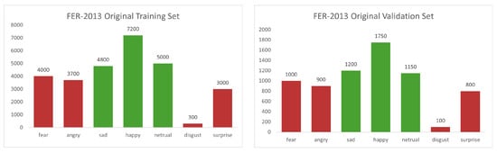 We cannot use this structure because it is necessary to merge it with other datasets and proceed with the splitting into three different subfolders (training, testing, and validation). Finally, we can analyze some features of the sample distribution separately between training and validation folders. Figure 2 represents the graph distribution of various classes in the FER2013 dataset, where red bars indicate values below the mean and green indicates values above the mean, where means are equal to 4100 and 1100 for training and validation sets, respectively.