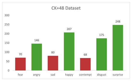 Figure 4 represents the graph distribution of various classes in the CK+48 dataset, where red bars indicate values below the mean and green indicates values above the mean, where the mean is equal to 142. According to the final classification, we do not have any samples for the disgust class, and contempt has fewer samples; pixel values are in the total range (0.255) for a single channel. Images are in PNG format; we will convert them to JPG to normalize images under a single format. The algorithms used for compression are the primary distinction between JPG and PNG. To make the file smaller, JPG employs a lossy compression method that discards some of the image data. PNG, in contrast, employs a lossless technique that preserves all the data; however, given the great number of files that we will generate from data augmentation, we decided to have lower-quality resolution images with reduced size compared to high-quality ones because of the small amount of data in PNG; the image noise applied on their conversion did not have a proportionally huge impact on the final dataset, and some added noise can increase the resistance of the model.