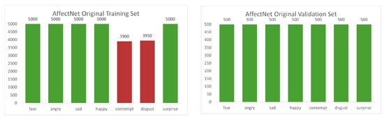 The graph distribution of different classes in the AffectNet dataset is shown in Figure 7, where red bars denote values that are below the mean and green bars denote values that are above the mean, which is equal to 4690 for the training set and 490 for the validation set, respectively. Image extensions are totally saved in Google Drive, and each dataset uses RGB channels for colouring and comes in a variety of sizes (the total amount of data is around 2 GB).