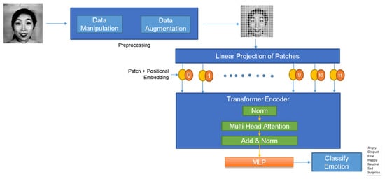Emotion recognition helps humans understand the intentions and psychic conditions of the human mind. Nevertheless, an individual will not be able to recognize the human mentality accurately. Emotions are fundamental features of humans that play an important role in social communication [,]. Automated emotion recognition can help numerous domains such as education, healthcare, cybersecurity, human–computer interaction (HCI), human–robot interaction (HRI), and virtual reality to sense the stimuli of the human brain by applying various modalities such as images, videos, audio, and text. Humans express emotion in various ways, including facial expression [,], speech [], and body language []. Facial expression analysis is the most popular and well-researched element related to emotion recognition. The main objective of this research is to investigate and check the feasibility of the Vision Transformer in the emotion recognition domain by utilizing a combination of well-known datasets for FER. High-quality data are being gathered in this area to meet the system’s requirements for sensing, processing, and simulating human emotions.