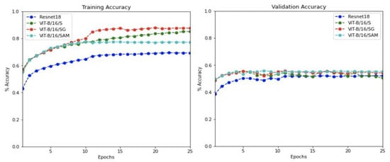 Figure 10 represents the training and validation accuracy change over time for the ViT-B/16 and ResNet-18 configurations that have been proposed. The main variances are caused by the transformers’ steady learning rate, which results in a gradual increase in training accuracy along a regular curve, whereas the validation accuracy first experiences an increase before plateauing at about 55%, even for the ResNet-18. Hence, adopting the Vision Transformer on the gradual learning rate can improve the training accuracy curves, but performances in the validation accuracy remain similar.