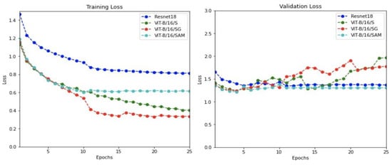 The following Figure 11 represents how training and validation loss change for the proposed Vision Transformer configurations and compares them with the ResNet-18 behavior. According to the plots, ResNet-18 maintains a high training loss over time compared to ViT configurations. Due to the smoothing of the loss landscapes, the SAM-based ViT-B/16 in this work achieves a validation loss that is equivalent to ResNet-18, while the ViT-B/16/S and ViT-B/16/SG exhibit a comparatively high validation loss due to insufficient data.