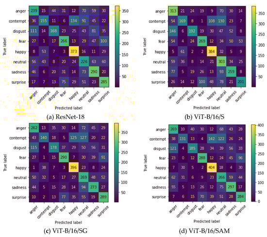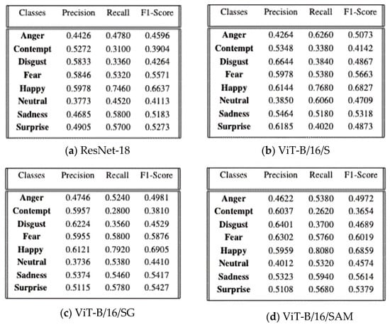Table 2 represents the average accuracy and loss incurred in ResNet-18, ViT-B/16/S, ViT-B/16/SG and ViT-B/16/SAM. Because of a lack of data for the contempt class, we evaluated the models on AffectNet considering only the seven less-augmented classes (original classes without contempt). Finally, for a more detailed evaluation, we have written the precision, recall, and F1-score distribution over classes and confusion matrix on the testing set for every tested model in the metric distribution section.