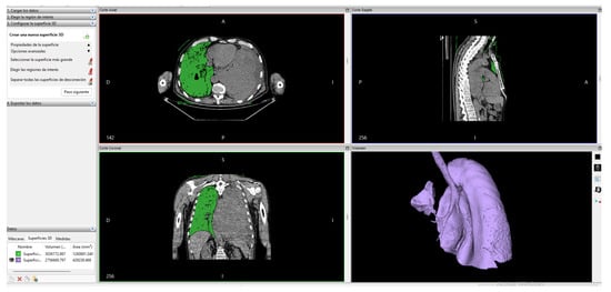 SFT causes Doege-Potter syndrome (DPS), a paraneoplastic disorder with symptomatic, severe, and persistent hypoglycemia), being a rare cause (2–4% of cases) of which some cases have been described [,,]. To distinguish SFT from other intrathoracic tumors, computed tomography (CT) is advantageous since it presents as a homogeneous round and well-defined mass between 10 and 20 cm in diameter []. Surgical management of the tumor is the treatment of DPS. Chemotherapy, radiofrequency ablation, cryoablation, or chemoembolization are tools used in SFT/DPS. Additionally, management of hypoglycemia is mandatory and glucocorticoids improve insulin-related outcomes in the course of the disease. The prognosis is favorable but depends on the size of the tumor and the paraneoplastic complications, so there have been reports of cases with successful follow-up [,]. Given a tumor that causes a paraneoplastic syndrome, with slow growth and that adopts a large size oppressing the affected lung, it is crucial to approximate the actual size of the tumor with the use of software from the images obtained in radiology [].