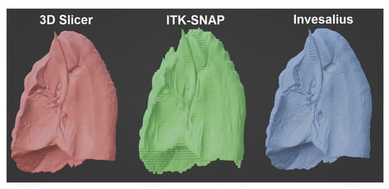 The use and comparison of these open-source tools for segmentation have been used in multiple parts of the body, such as bones, as is the case of the work of Matsiushevich et al. [], where they analyzed as points of comparison the weight and quantity of triangles of the exported models. There are also antecedents in the literature of its use in tumor sections located in the brain, such as glioblastomas; an example is an article presented by Fyllingen et al. [], where it is concluded that the best performances at the level of time expenditure are those of 3D Slicer and ITK-Snap. But in the literature, there are no reports of using this software for a rare syndrome like the one presented in this study, where the tomography contrast is not very different from other organs.