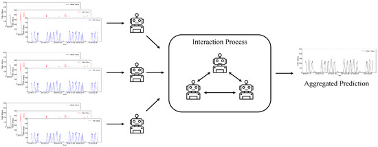 Mathematically, the influence between different agents in the interaction process is modeled as an adjacency matrix W with row sum 1. Denote that there are m agents and the agent set is I. Each agent trains a base prediction model with L layers. Denote as the mapping function for layer ℓ of agent i, to extract information from the input historical data. The distributed multi-agent learning in a single iteration is formulated as follows: