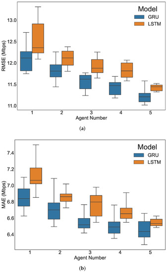 The evaluation results with different agent numbers for the LSTM and GRU models are shown in Figure 4, which are box and whisker plots for ten separate runs. With the increase in agent numbers, both LSTM and GRU demonstrate better performance with decreased RMSE and MAE values. GRU maintains a better performance than LSTM in Figure 4. While adding more agents into training might bring a further potential performance improvement, the marginal improvement becomes increasingly smaller. In addition, it becomes more difficult to coordinate more agents in practice. Thus, an agent number up to 5 is used in this paper. Since the research motivation of this paper is to validate the superiority of the distributed multi-agent learning approach over traditional centralized learning, we leave the exploration of using more agents in the follow-up studies.
