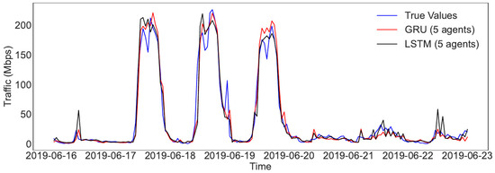 Figure 5 further shows the comparison between true and predicted results for the first week in the test set. For clarity, only a single run with five agents is plotted for LSTM or GRU. From Figure 5, the predictions from both models present a similar pattern with the true values. However, LSTM generates larger predicted values when the true values are small, e.g., from 22 June 2019 to 23 June 2019, which results in a larger error than GRU. In other words, the GRU-based scheme is more stable, with less extreme predicted values than LSTM and a better overall prediction performance.