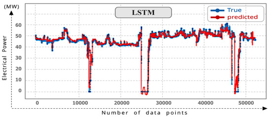 On the other hand, and in light of the performance results obtained in (Table 3), the model based on the long short-term memory (LSTM) algorithm offered a better quality of prediction of the electrical power parameter. This performance was seen in the R-squared metric score, which was the highest (≈98.39%). However, the scores of the two metrics RMSE and MSE, which interpreted the errors, were, respectively, 0.241 MW and 0.058 MW.