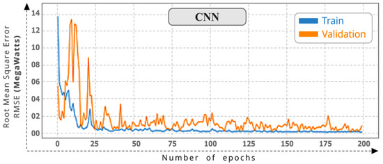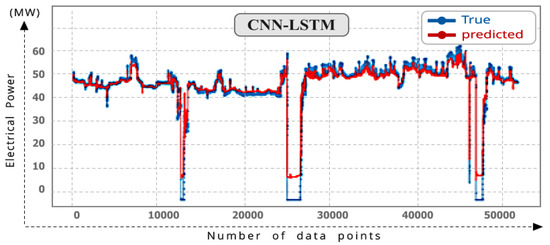 Similarly, and by training the model based on the CNN-LSTM algorithm, we were able to maintain a high R-squared score (≈98.29%) and also minimize the error margins generated by LSTM to achieve an RMSE of 0.1199 MW and MSE equal to 0.0143 MW. This improvement confirmed that the CNN-LSTM hybrid mode is very suitable for power prediction.