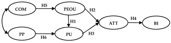 Due to the rapid changes in technology, several studies have recommended integrating TAM with DIT to better understand the users’ adoption patterns [23,24]. The diffusion of innovation theory (DOI) could be considered as one of the most popular theories that have attempted to predict factors that affect an individual to adopt an innovation or a new technology [25,26]. DIT is an extensive social and psychological theory that seeks to explain the stages that show how new ideas and technology spread among people in different societies, climates, or culture environments. Rogers identified five attributes of innovation that are considered to determine the rate of innovation adoption behavior, which are relative advantage, compatibility, complexity, trialability, and observability [25]. According to Rogers, relative advantage is “the degree to which an innovation is perceived as being better than the idea it supersedes” [25]. Compatibility refers to “the degree to which a service is perceived as consistent with users’ existing values, beliefs, habits, and present and previous experiences” [25]. Trialability is “the degree to which an innovation may be experimented with on a limited basis” [25]. Observability is “the visibility of the innovation” [25]. Compatibility is a vital feature of innovation as conformance to the user’s lifestyle can advance a rapid rate of adoption [27]. An idea that is incompatible with the users’ values or needs will not be rapidly adopted compared to an innovation that is compatible. Researchers indicated that compatibility is a significant antecedent in determining consumers’ attitude towards internet banking adoption in Malaysia [28]. Compatibility had a significant correlation with computer adoption and use of mobile banking in Saudi Arabia [29]. Based on the literature discussed above, we added compatibility into the expanded TAM model and hypothesize the following: