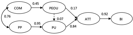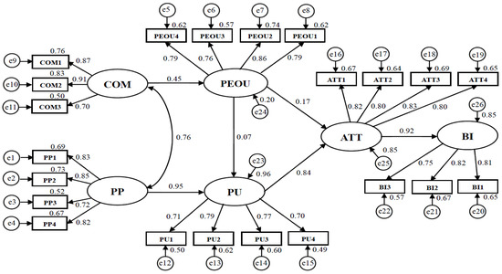 To assess the reliability and validity of the constructs, we conducted a confirmatory factor analysis (CFA) to test the convergent validity of each construct. A single factor model was specified for each of the constructs. The measurement model included 22 items describing six latent constructs: PU, PEOU, PP, COMP, ATT, and BI. The factor loadings for the various question items of the COM construct ranged between 0.70 and 0.92, PU construct ranged between 0.71 and.83, PEOU ranged between 0.76 and 0.86, PP ranged between 0.73 and 0.86, ATT ranged between 0.80 and 0.84 and BI ranged between 0.77 and 0.82. Convergent validity of the constructs with all factor loadings exceeding 0.70 was demonstrated to be good to excellent on their own constructs [40]. The values of composite reliability (CR) for each construct were 0.87, 0.88, 0.86, 0.89, 0.89, and 0.84, which were all clearly above 0.70 for all constructs, providing internal consistency. The values of AVE were in the range of 0.61 to 0.70, providing a reasonable convergent validity according to Fornell and Larcker [41].