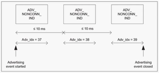 The BLE 4.2 [30] specifications for connectionless message transmissions define the Broadcaster/Observer communication paradigm, in which the Broadcaster transmits the advertisements (ADVs) containing data and the Observer receives them (the Broadcaster and Observer roles can alternate). For the ADV transmission, the specifications allow for the adoption of only 3 of the 40 channels available in BLE. The ADVs are transmitted within a time interval called an advertisement event, as depicted in Figure 2. Within an advertisement event, multiple ADVs can be transmitted, each one being transmitted on a different channel (starting with the first channel reserved for the ADVs). The time interval between two consecutive ADVs within the same advertisement event has to be lower than or equal to 10 ms.