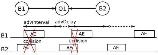 Using the Broadcaster/Observer paradigm described above, there is no synchronization between the transmissions of nodes. This entails a high probability of message collisions, as the ADV transmissions from two or multiple nodes may overlap. Looking at the example in Figure 3, there are two Broadcasters (B1 and B2) that transmit ADVs (for the sake of simplicity, we assume that a single message can be transmitted within each advertisement event). The Observer (O1) will not receive any message during the first two advertisement events of both the Broadcasters, as the messages collide. At the third advertisement event, the Observer will receive both messages.