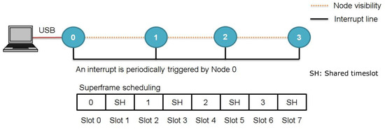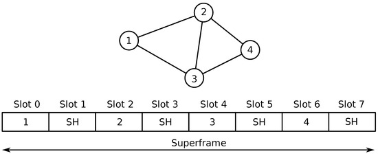 To achieve this, in RESEMBLE, time is divided into time intervals, called superframes (Figure 5), which are, in turn, partitioned in timeslots. Each network node is statically assigned one or multiple timeslots to transmit a single message using the ADV event. In the remaining time of the superframe, the node remains in scanning state to receive the messages transmitted from the other nodes. With this approach, each node knows the exact time at which it can transmit a message and is also aware of the transmission times of the other nodes. One or multiple timeslots within the superframe are marked as shared timeslots (SH in Figure 5) and are to transmit non-real-time messages. The transmission within shared timeslots is regulated by a random backoff algorithm. Before starting the transmission, a node with an outgoing non-real-time message has to wait a random number of shared timeslots, thus decreasing the collision probability.