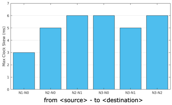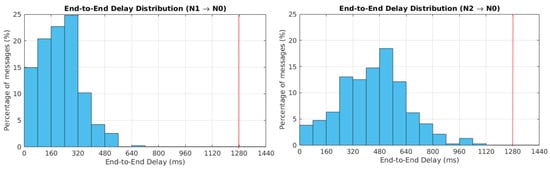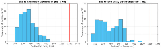 In this case, the e2eDelay of the messages transmitted by the Node 3 are lower than the theoretical maximum e2eDelay (i.e., 1280 ms). In this case, the messages follow a two-hop path; therefore, the e2eDelays are higher than those of the messages transmitted by Nodes 1 and 2. The same holds for the messages transmitted by Node 0 delivered to Node 3.
